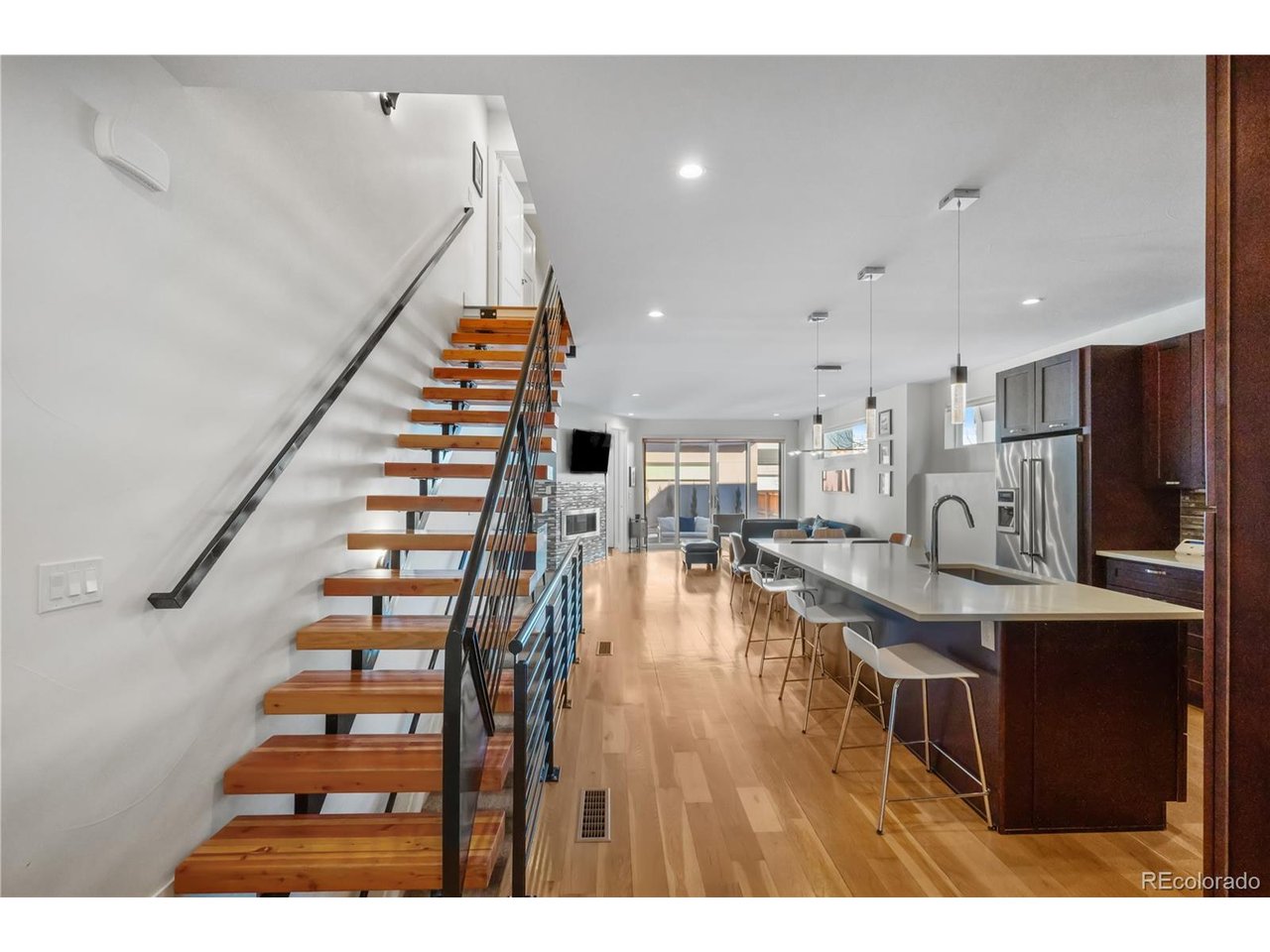 Located in Denver's Berkeley neighborhood, two blocks from the energy of Tennyson Street, this 2015-built modern half duplex offers 3 bedrooms, 5 bathrooms (3 full, 2 half), and 3,392 square feet of thoughtfully finished living space. A bright, open-concept main level is anchored by contemporary design and everyday function, featuring large windows, hardwood flooring, quartz countertops, and custom cabinetry, with seamless flow for hosting or daily life. Upstairs, two spacious bedrooms provide privacy and comfort, while the finished basement adds flexibility with a third bedroom and 9-foot ceilings, ideal for guests, a home office, or a media/gym setup. The home continues to impress on the third floor with a dedicated entertainment room and access to the rooftop deck, creating an elevated indoor-outdoor lifestyle that fits Berkeley's social, walkable vibe. Outdoor spaces have been meaningfully upgraded, including a hardscaped rear patio, a xeriscaped yard with drip system, and a Trex deck, with over $50,000 invested in landscape and hardscape improvements. Additional highlights include a Class 4 impact-resistant roof (2020), two AC units, two furnaces, a French drain system running to the alley, a detached 2-car garage, and notable updates such as upgraded doors and a rooftop shade system. Enjoy modern construction, low-maintenance outdoor living, and an unbeatable Berkeley location close to parks, dining, and local favorites along Tennyson.